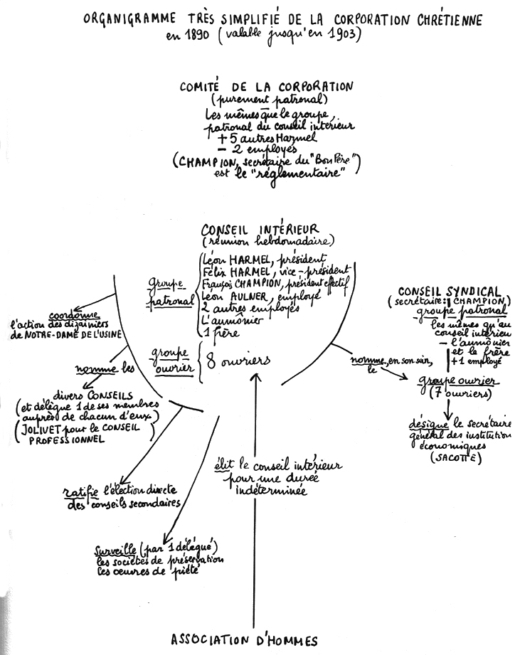 Plus tard, émus par les atrocités de la Commune, des membres des « classes supérieures » cherchent les bases d'un ordre social nouveau et plus juste. Ils se tournent alors vers celui que ses ouvriers appellent le (Bon Père». Lui seul peut leur apporter ce qui leur manque : une pratique sociale née de la connaissance directe des ouvriers. Le premier, Mgr de Ségur, président de l'Union des Œuvres ouvrières, comprend l'importance du Val des Bois comme laboratoire social. En 1873, c'est le tour d'Albert de Mun. L'Œuvre des Cercles en est modifiée : l'influence réciproque qu'exercent l'un sur l'autre, au cours d'une discussion théorique, La Tour du Pin et Léon Harmel, aboutit en 1875 à la conception pratique d'une corporation rénovée (8). Il semble bien que ce soit La Tour du Pin, justement, qui ait " appris » le terme même de corporation au patron du Val des Bois. Ce dernier donne alors le nom de corporation chrétienne à l'ensemble coordonné des institutions de son usine. Persuadé désormais de détenir la solution du problème ouvrier dans son ensemble, il publie en 1877, sur l'instigation de ses amis de l'Œuvre, la première édition du Manuel d'une Corporation chrétienne. Il commence alors un effort de propagande inlassable auprès des patrons (9). Cet effort se poursuit non sans succès jusqu'en 1893. Ainsi naît et se développe une idéologie.