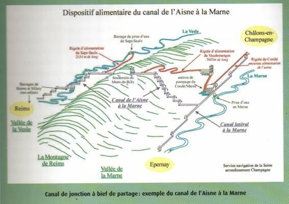 Le bief de partage du Mont-de-Billy reçoit de l’eau d’une part par une prise d’eau alimentée par un barrage sur la Vesle à Sept-Saulx et d’autre part par la Marne, à Condé-sur-Marne où a été construite l’usine d’élévation des eaux à partir de 1867.
