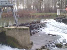 Construit en 1870, ce type de barrage a été inventé par l’ingénieur Poiré en 1830. Il est constitué de « fermettes » articulées, reliées entre elles par une passerelle qui traverse la rivière. Chacune d’elles comporte une partie mobile que l’on peut lever ou baisser en fonction du niveau d’eau souhaité. La partie mobile est constituée de poutrelles verticales juxtaposées : les « aiguilles ». Ces éléments doivent être manipulés les uns après les autres, et le relevage et l’abattage des aiguilles est un travail long, pénible et dangereux. Ce type de barrage disparaît progressivement.
