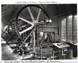 Elle a d’abord utilisé l’eau qui venait depuis Châlons par la rigole d’alimentation. Cette eau, par le truchement d’une chute de 6,92 mètres de haut, actionnait 5 turbines Koechlin placées en ligne en sous-sol. Elles étaient alignées à 10 mètres l’une de l’autre. Chaque turbine, par l’intermédiaire d’un pignon et d’une roue d’angle, transmettait le mouvement à un arbre horizontal. Des bielles, attachées aux extrémités de chaque arbre horizontal, actionnaient alors des pompes verticales à double effet installées à droite et à gauche de chacune des trois turbines centrales..
