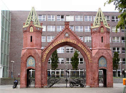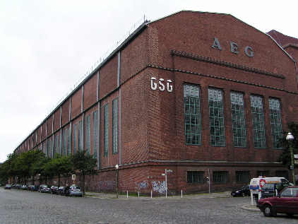 L’usine AEG de Berlin (Wedding) est construite en 1896-97 par Franz Schwechten, agrandie et transformée en 1911 par Peter Behrens. AEG y fabriquait du matériel de chemin de fer, des moteurs et du matériel électrique jusque sa fermeture dans les années 80. Aujourd’hui les lieux sont occupés par l’université technique de Berlin. |