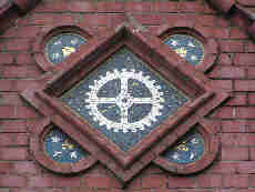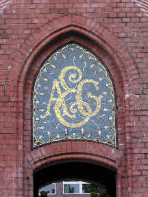 L'ancienne porte de l'usine AEG. Décors de mosaïque qui évoquent les activités de l'entreprise |