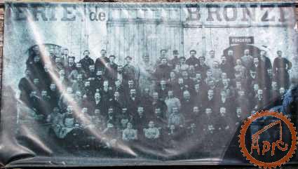 On remarque sur la photo la présence d'enfants au premier plan et d'une statue parmi les ouvriers.