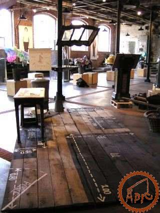 Reconstitution d'un logis d'une famille d'ouvrier selon des archives : l'estrade représente la surface au sol, avec les éléments indispensables et en particulier le poêle de chauffage.