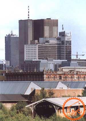 Le centre des affaires de Bruxelles, de l'autre coté du canal, domine Tour et Taxis.