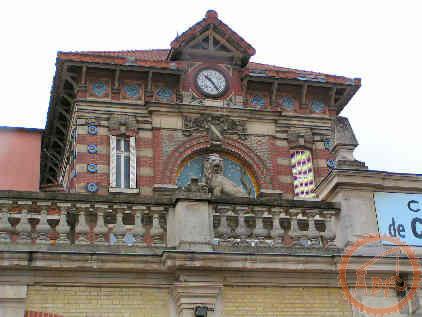 L'arrière du pavillon central, décoré avec un lion tenant les armes de Champagne : c'est l'emblème de l'Union Champenoise (la marque à l'origine de la construction des bâtiments)