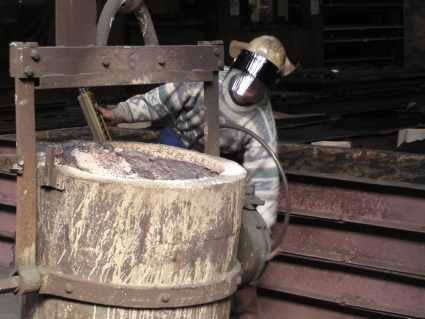 Les ouvriers enlèvent la "peau" qui recouvre le métal en fusion, celle ci s'est formée pendant le court transport du godet par refroidissement du métal.