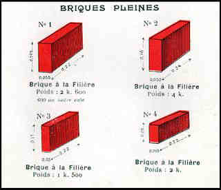Les briques étaient fabriquées par une petite mouleuse avec un malaxeur qui, par pression de la terre, sortait par une filière correspondant au produit à fabriquer, c’est-à-dire la forme de la brique. Il y avait plusieurs sortes de briques : 15/20 et 11/16 pour les murs, 5/16 appelée plâtrière et 5/8/11/20 appelée 4/8 qui servaient à faire les murs, mais aussi les cheminées couvertes avec une mitre et une lanterne. A part les 4/8, le reste des briques était coupé en longueurs de 40 centimètres.