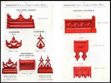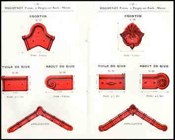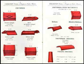 Il y avait plusieurs sortes d’accessoires : faîtières losangées, ½ rondes, arêtiers, tuiles à douille, lanternes, frontons, abouts de rives de faîtières, d’arêtiers, ½ tuiles panne et H14, écussons, chatières pour l’aération de la charpente, mitres, porte-poinçons, enfin tout ce qui pouvait mettre en valeur un toit rouge ou émaillé de certaines couleurs.