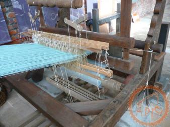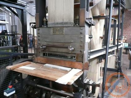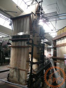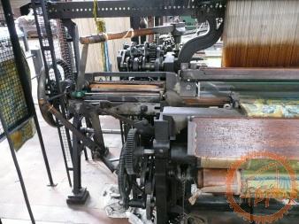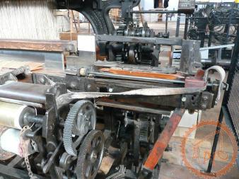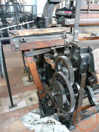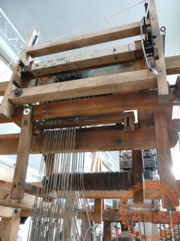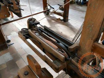 Métier mécanique Nuyts - à bras de chasse, il dispose de 3 navettes et de 6 mécaniques Jacquard