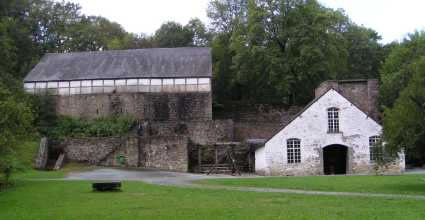 La forge : à gauche, la halle à charbon de bois, et l'arrivée d'eau pour actionner les soufflets. A droite, la halle de coulée.