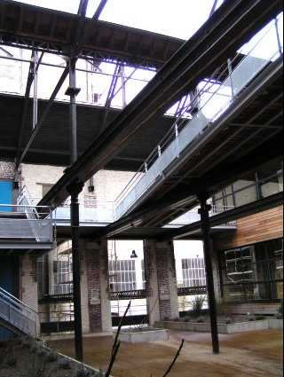 Au cœur du centre d'activité tertiaire, un atelier est transformé en halle d'accueil.