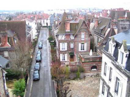 | Vue de la terrasse de l'usine Bonbon, la Villa Courtalon : ensemble de grosses maisons bourgeoises et patronales. La maison en pierre à droite est la maison patronale Mauchauffée. La rue et les espaces entre les maisons sont pavés. Les jardins comportent des éléments décoratifs raffinés. |