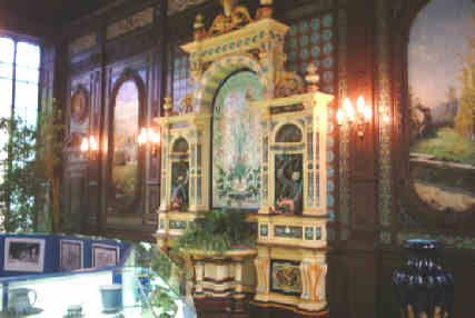 Une fontaine en carreaux de faïence occupait tout un mur. Elle était entredeux dauphins et une grande vitrine présentait de la vaisselle : assiettes, plats, théières, vases…. Un paon coloré était dressé au centre de la salle.