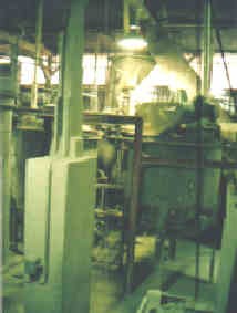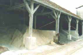 Le kaolin, l’argile et le sable, livrés par wagon, sont stockés sous cet abri. | Dans ces délayeuses, une grande hélice mélange le kaolin, l’argile et le sable avec de l’eau. |