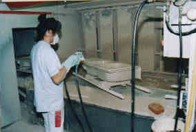 Il faut alors enlever les impuretés avec du pétrole, puis on met une couche d’émail au pistolet. L’émaillage rend la pâte lisse, solide et imperméable.